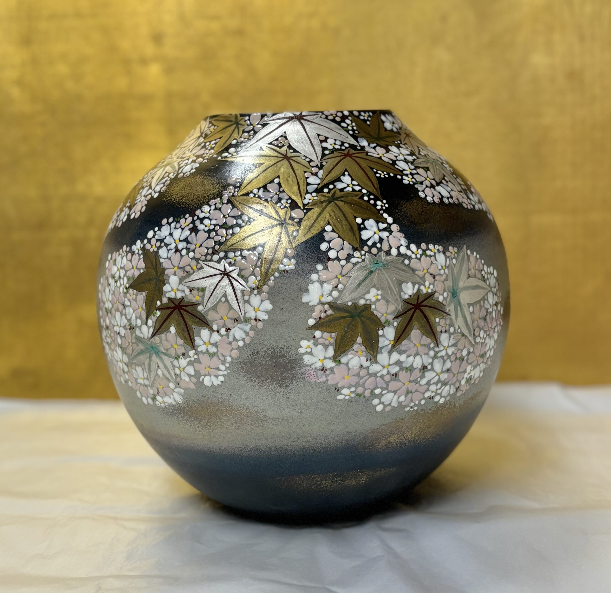 満開の桜と金箔銀箔の施された紅葉が華やかなお正月にぴったりの花瓶です。
